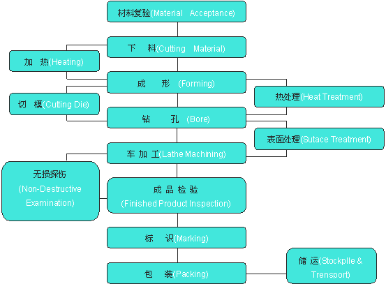 不銹鋼及鎳基合金法蘭生產工藝流程一般分為以下七個步驟:材料、斷料(下料)、加熱、鍛造(成形)、熱處理、切削(車加工)、檢查。